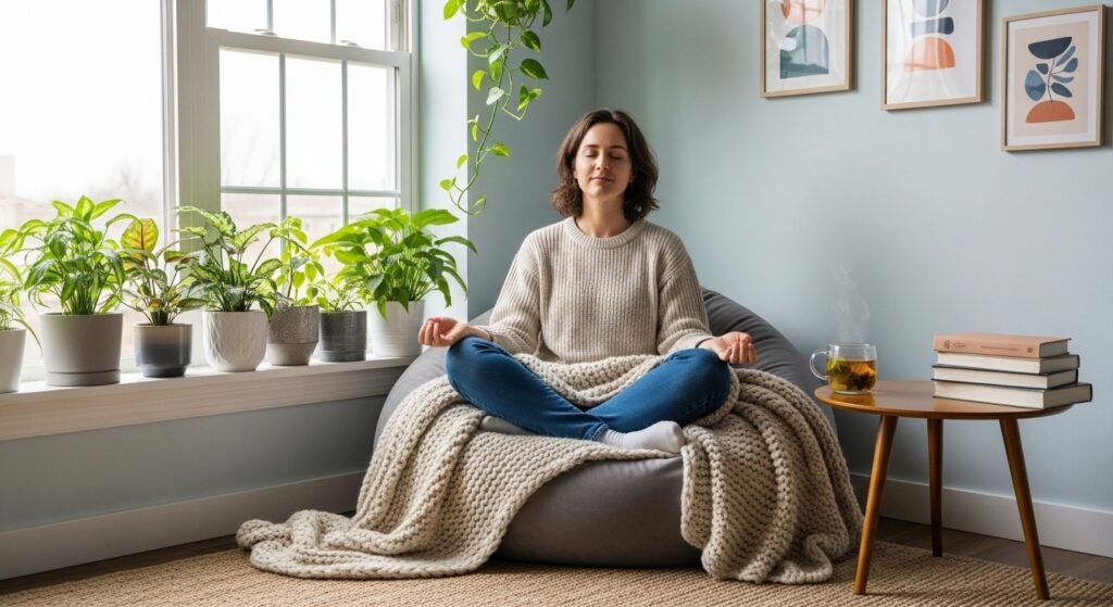 She started by transforming a corner of her apartment into a cozy retreat, with familiar objects, calming scents, and soft lighting.