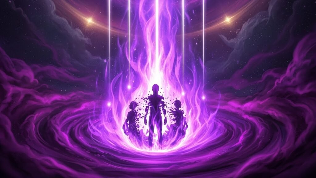 Violet flame transmutation invokes 8th ray alchemy energy protection technique for empaths dissolving karmic contracts, generational curses, psychic attacks burning impurities violet-white ash safely.