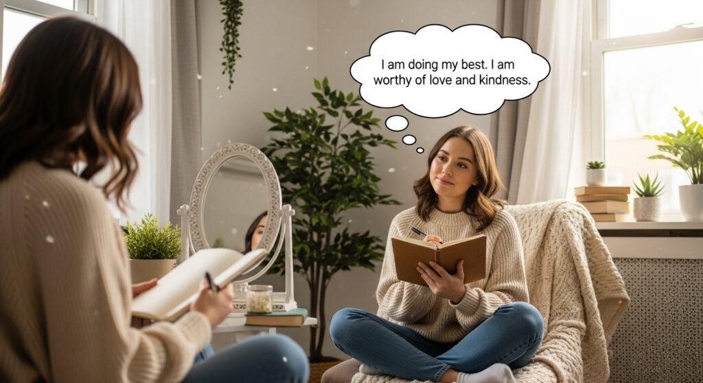 | Compassionate Self-Talk | Affirmations, mental reframing | Self-acceptance, resilience | Ongoing practice | Journal and meditate on affirmations | Self-doubt, critical thoughts | Be patient and gentle |